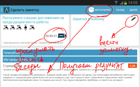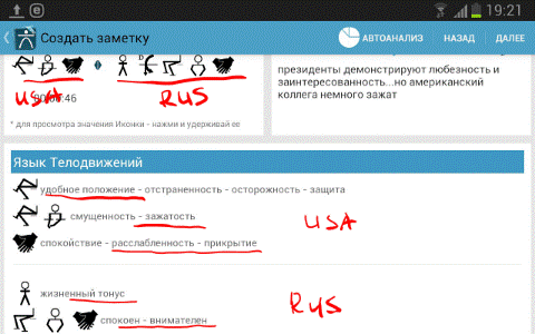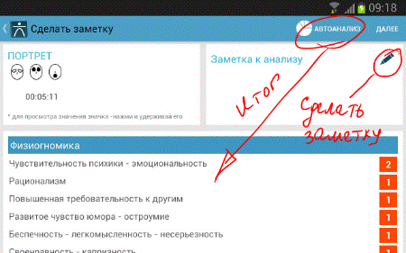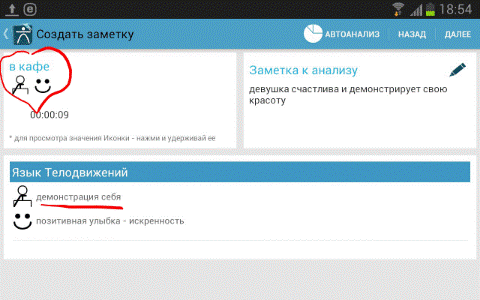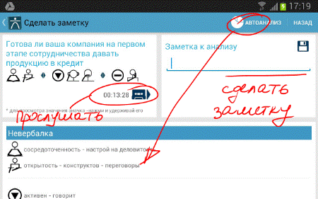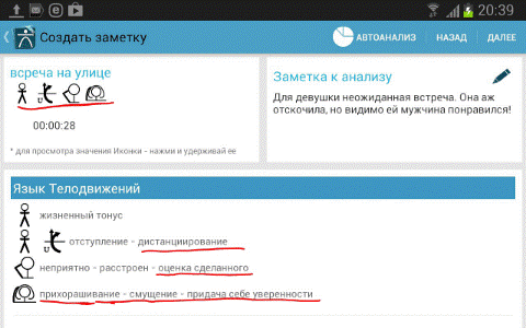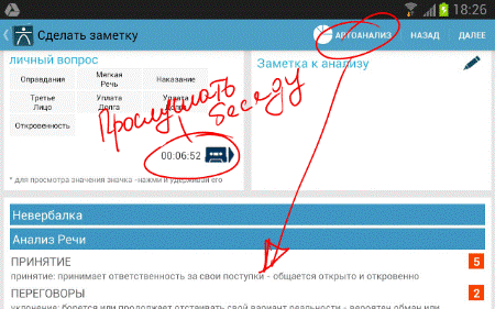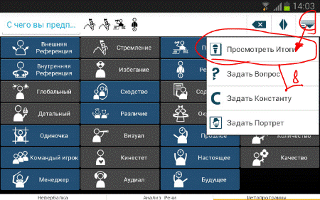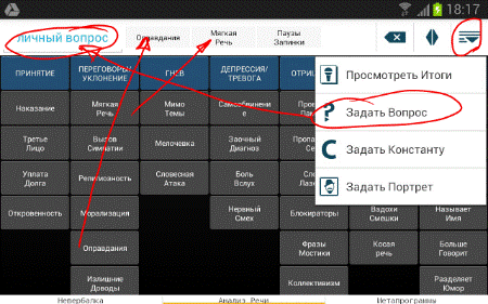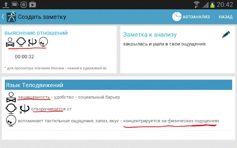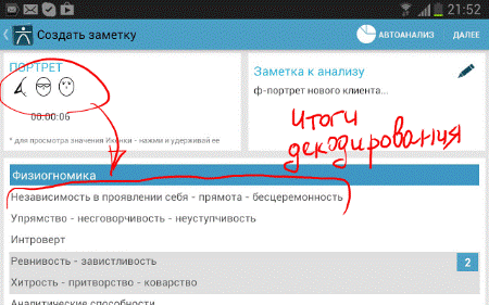 6. В конце переговоров или, как вариант, по ходу, выбираем <Просмотреть итоги> и, далее <Автоанализ>. Декодер просчитает все зафиксированные комбинации клавиш и выдаст нам конечный или промежуточный итог, того, что же на самом деле говорит невербальный язык собеседника. При необходимости активизируй функцию <Диктофон> и прослушай ваш записанный диалог