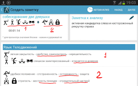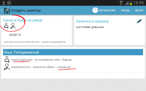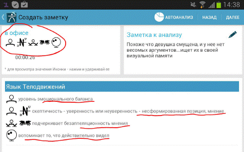 Описание: Более тысячи вариантов и комбинаций запрограммированы в декодер приложения. Это не просто отдельно взятые жесты или позы, качество речи, но также, их всевозможные их комбинации, сочетания, динамика изменений. При помощи приложения можно зафиксировать любые изменения в поведении собеседника и его словах: жесты рук, ног, наклоны головы, положение тела, взгляд, улыбка, перемена позы, манипуляции пальцами, предметами, качество речи (темп, тон, громкость, дисбаланс речи), эмоциональность проявления и др. Анализатор (декодер) приложения оперативно обработает все наработки пользователя и выдаст готовый результат. Рабочая панель построена на основании обработанных и систематизированных трудов: Д.Ниренберг, А.Штангель, Ш.Шпис, Т.Штробель, А.Пиз, Д.Оконер, П.Экман, А.Леонтьев.