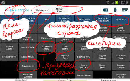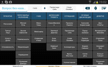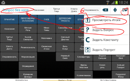 4. Открывается клавиатура, состоящая и наименований признаком (в нашем случае, вербальных сигналов) соответствующих испытываемому состоянию. На клавиатуре основных категорий таковых состояний семь: Принятие, Переговоры, Гнев, Тревога, Отрицание, Речевой дисбаланс, Доверие. Вербальные сигналы относящиеся к трем из категорий, могут явно указывать на утаивание или обман