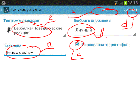 - Вводим <Название>, например, имя собеседника. Функции <Выбрать опросник> и <Использовать диктофон> при данном типе — неактивны