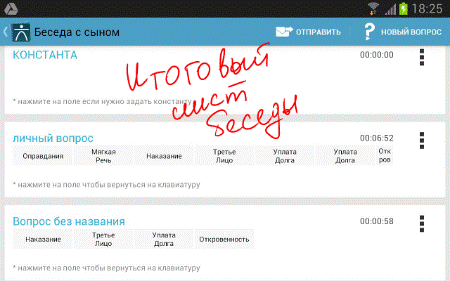 5. Итак, если фон беседы задан, и она началась, твоя задача внимательно слушать (слушать можно где угодно и кого угодно, будто жена или партнер по бизнесу или бос, другое дело уместно ли применить клавиатуру) своего сына и при помощи клавиатуры фиксировать проявленные сигналы. Если хочешь или если у тебя есть специально подготовленные вопросы, то занеси их в KС и двигайся в процессе беседы по ходу вопросов. Хотя вполне возможно обойтись и без этого