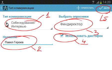1. Нажимаем старт (большая круглая кнопка на главной странице приложения) и Выбираем <Тип коммуникации> –> Собеседование/Подбор кадров/Интервью