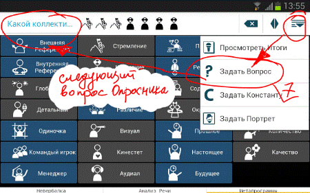5. Выбираем <Далее>. После, твоему обзору открывается клавиатура метапрограмм, по которым ты намеревался оценивать кандидата. В верхнем левом углу указывается первый вопрос из выбранного опросника «Финдиректор». При необходимости просмотреть вопрос целиком — нажми и удерживай поле вопроса