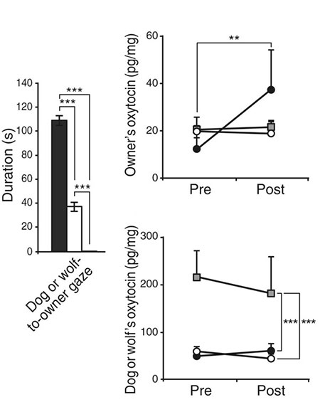 В отличие от ручных волков, собаки часто смотрят хозяину в глаза, что ведет к повышению у обоих уровня окситоцина — нейрогормона, стимулирующего проявления нежных чувств и развитие привязанности. По-видимому, склонность смотреть человеку в глаза, манипулируя поведением человека в своих интересах, развилась у собак в ходе одомашнивания, а не была унаследована от диких предков.