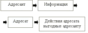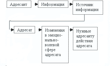Если проанализировать все вышеприведённые определения, то в структуре пропаганды можно выделить следующие элементы: адресанта, информацию, адресата и его действия, угодные адресанту и вызванные влиянием полученной информации. Представим это в схематическом виде: