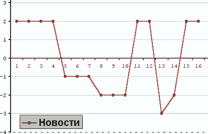 | 16.02.04-22.02.04 | Пт. 15%(-), 85%(+). Владивосток. В одном из Вузов неизвестная кишечная обнаружена инфекция. Карантин. (-2) Кабардино-Балкария. Найдено тело сноубордиста. (-2) Хабаровский край. Воровство оборудования. (-2) Сб. 35%(-), 65%(+) Грузия. Аджария. Беспорядки. (-2) Авария на железнодорожном переезде. (-2) Ирак. Теракт. (-2) |