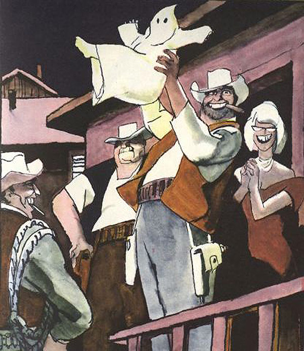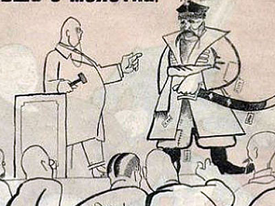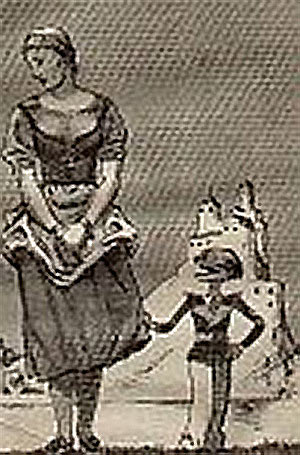 Другой вариант подобной демаскулинизации, обвиняющей Врага в немужском поведении — изображение его прячущимся за женскими спинами (или под женской юбкой). (СЮЖЕТ 17).